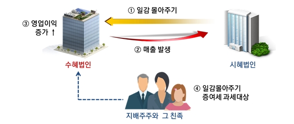 ○ 수혜법인(일감을 받은 법인)의 지배주주와 특수관계에 있는 법인(일감을 준 법인)이 수혜법인에게 일감을 몰아주어 발생한 이익을 지배주주와 그 친족주주가 증여받은 것으로 보아 증여세 과세