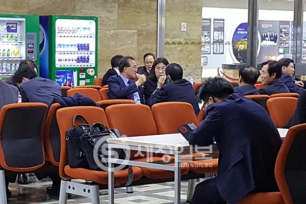 ▲ 2일 자정이 가까운 시간 '외부세무조정제도'가 본회의를 통과한 직후 백운찬 세무사회장을 비롯한 임원들이 세무조정제도의 법제화라는 역사의 현장에서 사진 한 장으로 '족적'을 남겼다. 한 임원은 회원간의 단결된 힘이 조정제도를 위기에서 구한 힘이었다고 소회했다.