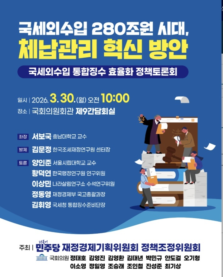 민주당 재정경제기획위원회 정책조정위원회(정태호·김영진·김태년·박민규·안도걸·오기형·이소영·정일영·조승래·조인철·진성준·최기상 의원)는 30일 오전 10시 국회의원회관 제9간담회실에서 국세외수입 통합징수 효율화 정책토론회를 개최했다.