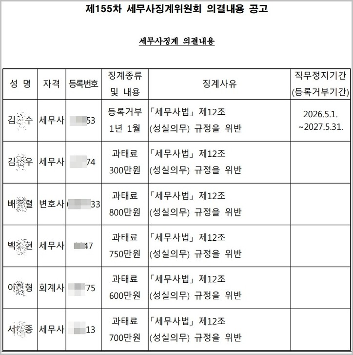 2일 재정경제부는 지난달 27일 열린 제155차 세무사징계위원회에서 징계가 의결된 이들의 명단을 관보를 통해 공개했다.