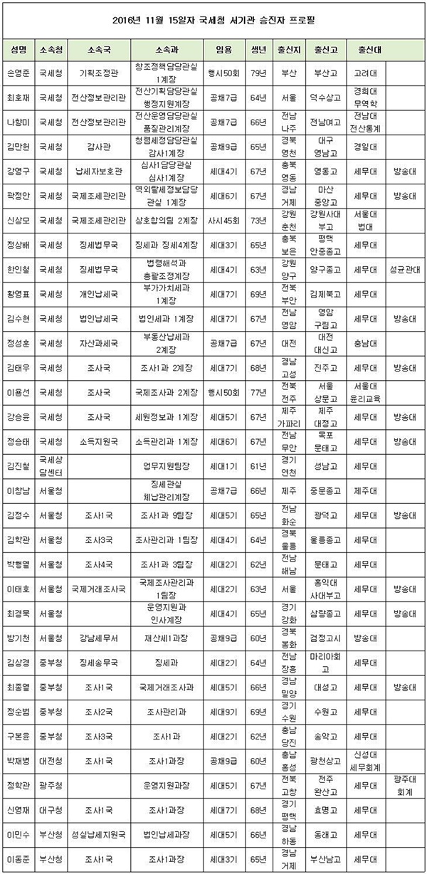 이번 인사에서는 또 79년생으로 행정고시 50회에 합격해 국세청에 몸담은 손영준 국세청 창조정책담당관실 사무관이 최연소로 기록됐으며, 지방청이나 국세청이 아닌 일선세무서 근무자로서 승진의 영예를 안은 방기천 강남세무서 재산세1과장이 최고령(60년생)이었다. 최고령자와 최연소 승진자와의 차이는 19년 이었다.