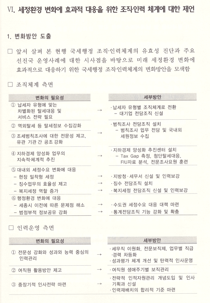 그리고 조세범칙 전담조직의 설치와 지하경제 양성화의 지속적 추진을 위한 지하경제 양성화 추진센터의 설치, 지방청·세무서의 신설 및 인력보강도 염두에 두고있다.