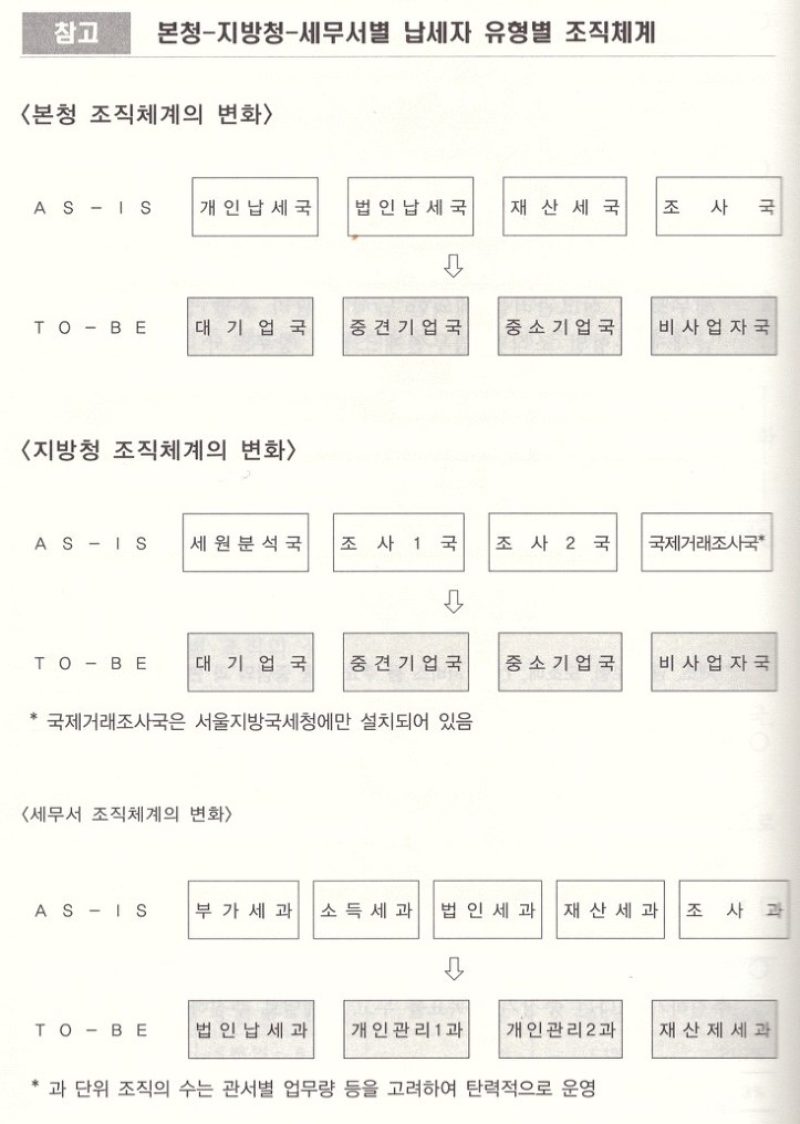 납세자 유형은 납세자를 사업자와 비사업자로 구분하고, 사업자 조직은 대기업국(외형 5천억이상), 중견기업국(500억~5천억), 중소기업국(500억이하) 등으로 구분해 관리하고 비사업자 조직은 개인 재산제세, 근로·투자 소득관리, 비영리·공익법인 관리, 원천세 총괄, 전자세원 업무 등을 담당토록 하자는 것.