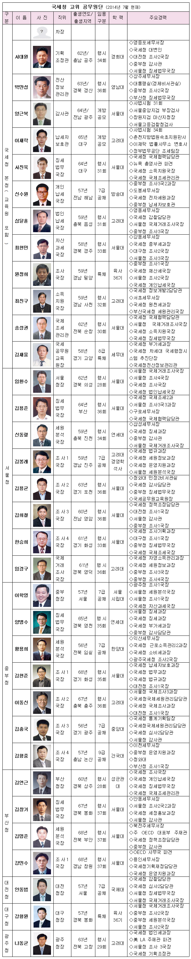 7월 21일 현재 국세청 고위공무원단(고공단)은 모두 34명이다. 올해부터 35자리로 한자리가 늘어났지만 지난달 27일 이전환 전 차장이 퇴직하면서 차장 자리가 비워 34명만 자리를 갖추고 있다.