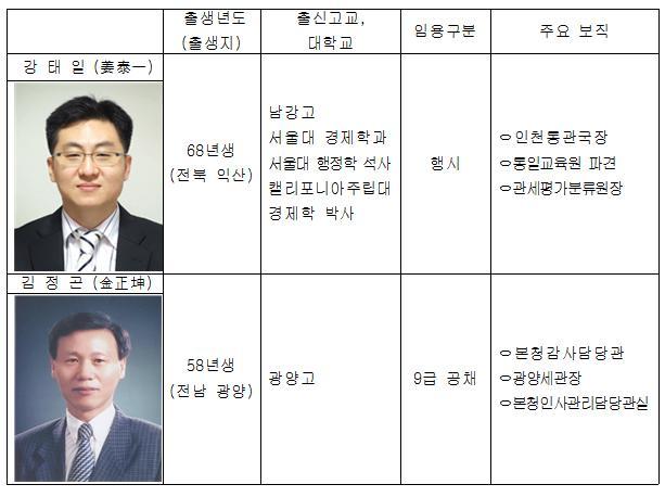 이번 인사는 김포세관 前방인성 세관장의 명예퇴직으로, 김정곤 감사담당관과 강태일 인천세관 통관국장이 각각 전보임명된 것이다.