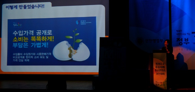관세청(청장 백운찬)은 24일 안전행정부 주관으로 국립중앙박물관 대강당에서 개최된 ‘정부 3.0 우수사례 홍보 경진대회’에서 ‘수입가격 공개 제도’ 홍보사례가 국민들이 평가한 최우수 사례로 선정되어 영예의 대통령상을 수상했다고 밝혔다.