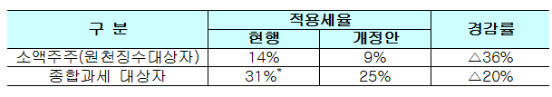 □ 원천징수세율을 종합과세대상자의 분리과세보다 더 큰 폭으로 인하하여 종합과세대상자보다 소액주주에 대한 세제지원 확대