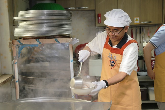 ◆김낙회 관세청장이 앞치마를 두르고 삼계탕을 직접 배식하고 있다.