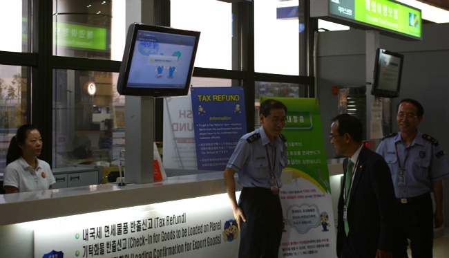 ◆ 김낙회 관세청장이 8일 추석을 맞아 김포세관 출국장 세관신고대를 찾아 근무직원을 격려하고 있다.