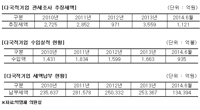 10일 국회 기획재정위원회 소속 새누리당 박명재 의원은 관세청으로부터 제출 받은 '다국적기업 탈세현황' 자료를 공개하면서 지난해 다국적기업의 관세 탈세에 대한 추징세액이 급증한 것으로 나타났다고 지적했다.