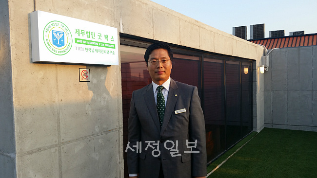 ◆…구재이 대표세무사가 세무법인 굿택스 사무실 앞에서 포즈를 취했다. 한국납세자권리연구소라는 명패가 눈에 띄었다.