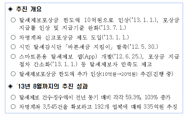 이에 따라 국세청은 앞으로도 탈세제보를 더욱 실효성 있게 지속적으로 확보하기 위해 포상금 한도액을 10억원에서 20억원으로 추가 인상하는 관련법 개정을 기획재정부와 함께 추진중에 있으며, ‘바른세금지킴이’ 등 시민사회와의 소통도 강화해 국민이 참여하는 탈세감시활동을 활성화해 나가겠다고 밝혔다.