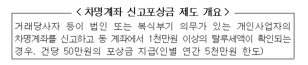 이와 함께 국세청은 올해부터 도입된 차명계좌 신고포상금 제도로 인한 신고도 지속적으로 증가하고 있다고 밝혔다. 차명계좌는 개인사업자의 대표자 명의 또는 법인 명의가 아닌 타인 명의의 계좌를 말한다.