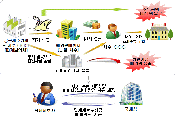 해외 특수관계자에게 저가 수출하여 이익을 이전하고 해외에 페이퍼컴퍼니를 설립하여 자금을 변칙 유출한 사실을 제보하여 탈루세액 추징하고 포상금 지급