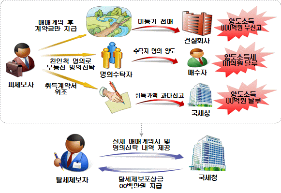 ○양도소득세 등 000억원을 추징하고 조세범처벌법에 따라 고발, 제보자에게는 00백만원 포상금 지급