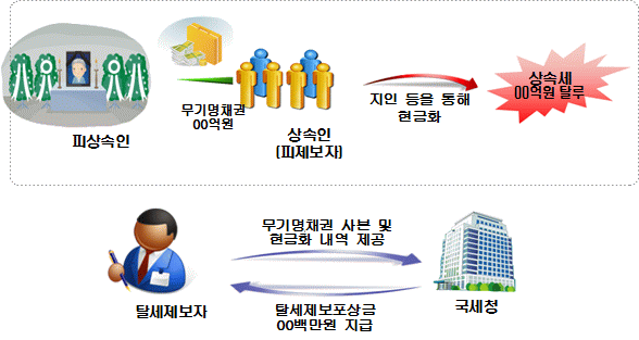 피상속인이 사전에 보유하던 무기명채권 사본 및 상속인이 현금화한 내역을 제보하여 상속세를 추징하고 포상금 지급