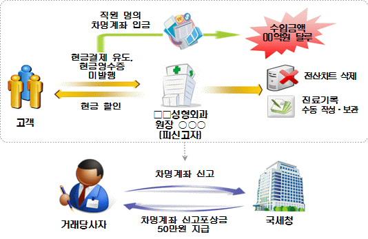 ○피신고자에게 소득세 00억원 추징하고 현금영수증 미발급 과태료 00억원 부과, 신고자에게는 차명계좌 신고포상금 50만원 지급