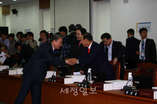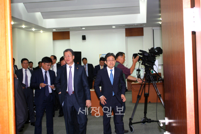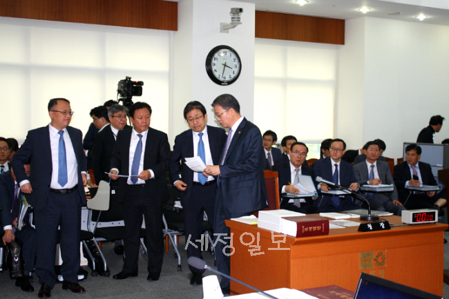 ◆휴~ 의원님들 수고하셨습니다…국정감사 질의가 끝난후 임환수 청장과 김봉래 차장이 국정감사장을 나서고 있다.