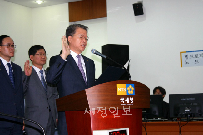 ◆국세청 간부들이 임 청장과 함께 선서를 하고 있다. 왼쪽에서부터 서대원 기획조정관, 김봉래 차장, 서진욱 징세법무국장, 심달훈 법인납세국장, 송성권 국제조세관리관, 최현민 자산과세국장.