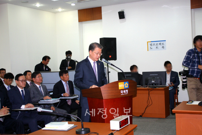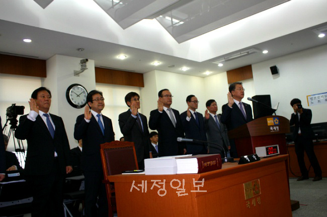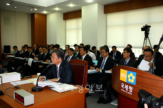 ◆ 국정감사를 수감하고 있는 국세청 간부들. 앞줄 오른쪽부터 최현민, 송성권, 심달훈, 서진욱, 김봉래(차장), 서대원 기획조정관.