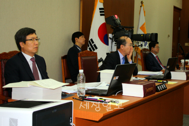 ◆잠시 휴식시간…임환수 청장이 김봉래 차장, 서대원 국장, 한승희 조사국장 등과 답변자료를 검토하고 있다. 국세청 핵심 간부 3명의 넥타이 색깔이 약속이나 한 듯 '파란색'이어서 눈길을 끌었다.