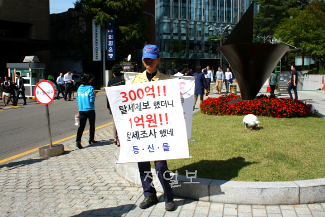 ◆국회 기획재정위의 국세청에 대한 국정감사가 진행된 서울 수송동 국세청장앞에서 한 납세자가 국세청의 세무조사를 비난하는 퍼포먼스를 하고 있다.