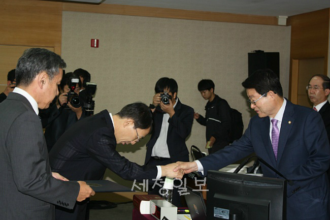 ◆…김연근 서울국세청장, 이학영 중부국세청장이 선서문을 정희수 위원장에게 전달하고 있다.