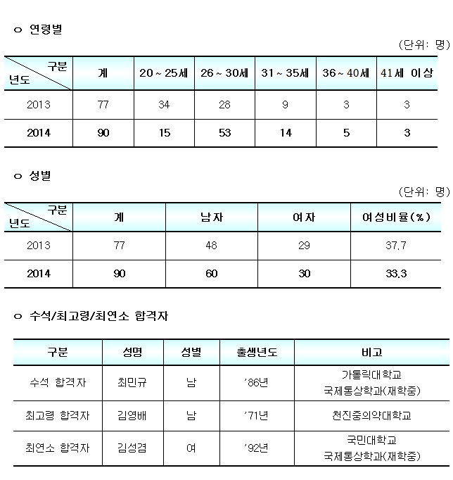 금년도 최종합격자 중 수석합격자는 최민규(만 28세, 남)씨가, 최연소 합격자로는 만 22세 김성겸(여)씨가 차지했다. 여성합격자는 총 30명(33.3%)으로 지난해 29명(37.7%)에 비해 1명 증가했다.