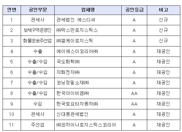 수여업체 중 (주)엘케이로지스틱 등 3개 업체는 신규로 공인을 받았으며, 한국아이비엠(주) 등 8개 업체는 기존 AEO 업체로서 공인을 갱신했다.