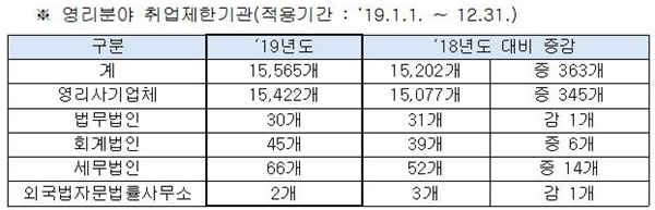 영리분야 취업제한기관은 작년보다 363개(2.3%) 증가한 1만5565개로 일반 사기업체 영리사기업체 1만5422개, 법무법인 30개, 회계법인 45개, 세무법인 66개, 외국법자문법률사무소 2개가 포함됐다.