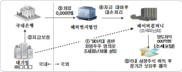 ○ 대기업인 ㈜□□□는 해외 현지법인 명의로 0,000만달러를 차입한 다음 ’90년대 중반 설립한 조세피난처 페이퍼컴퍼니에 자금을 대여하고