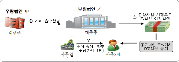 우량법인을 부실법인과 합병한 후 주식을 세부담 없이 사주 3세에 증여한 뒤, 부동산 개발사업 시행을 통하여 주식가치를 증가시키는 수법으로 편법 증여