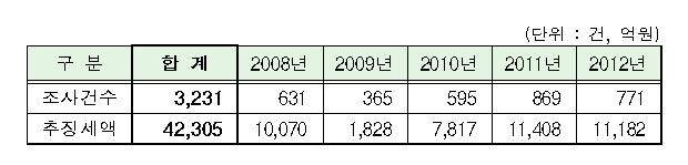 국세청은 이날 이 같은 자료를 발표하면서 지난 2008년부터 2012년까지 5년간 대재산가 3231명에 대한 세무조사를 실시해 모두 4조2305억 원을 추징했다고 밝혔다. 해당연도의 조사 숫자에 따라 추징액도 달라졌지만 대체적으로 해를 더해가면서 늘어난 것으로 나타났다.