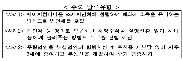 국세청은 실제로 조사결과 이들 대기업 대재산가들은 대규모 분식회계와 차명재산 운용, 우회거래를 통한 세금 없는 부의 대물림 등 고의적이고 반사회적인 탈루수법이 동원된 사례가 다수 확인되었다고 밝혔다.