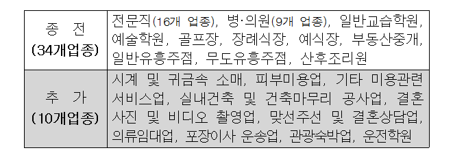 * (종전 9개업종)일반교습학원, 예술학원, 골프장, 장례식장, 예식장, 부동산 중개, 일반유흥주점, 무도유흥주점, 산후조리원 + ’13.10.1 추가 10개 업종