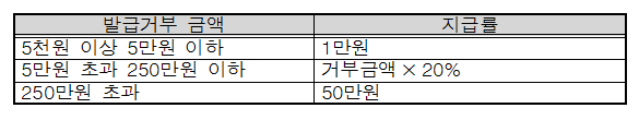 - 발급거부 신고포상금 20% 지급(한도 건당 50만원, 연간 200만원)