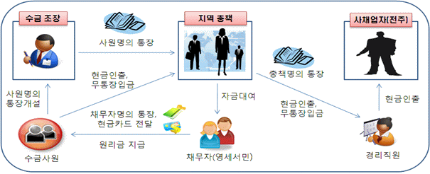 - 수금사원은 채무자 명의 통장·현금카드로 사채이자를 현금인출, 지역총책에게 미리 전달해 둔 본인명의 통장에 무통장 입금