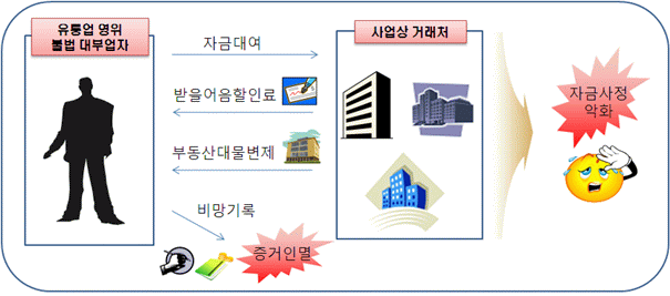 - 사업상 밀접한 거래관계를 맺고 있다는 약점을 노려 자금 미상환 시 부동산을 대물변제 받아 거래처의 자금사정이 더욱 악화