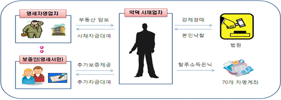 부동산·보증인을 담보로 자금을 대여하고 강제경매하거나 보증인에게 추가 대여하며 70여개 차명계좌로 탈루소득을 은닉한 악덕 사채업자