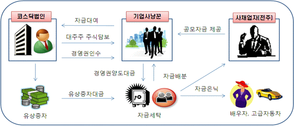 코스닥법인 대주주의 주식을 담보로 자금을 대여한 후 경영권을 인수하여 유상증자·경영권양도 대금을 세탁하여 호화사치 생활을 한 기업형 사채업자