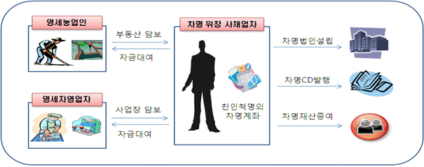 - 저신용등급, 여신한도초과 등으로 대출이 어려운 영세농업인 등에게 부동산 및 사업장을 담보로 고리사채를 대여하며,