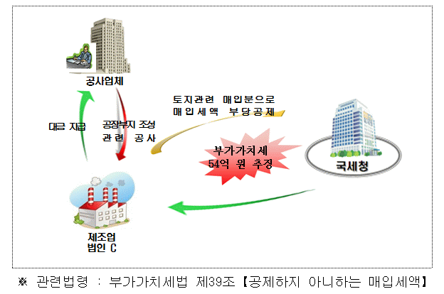 - 공장건물 신축공사 매입분 중 매입세액 공제 대상으로 부당하게 신고한 토지 관련 매입분에 대하여 매입세액 불공제하고 부가가치세 54억 원 추징(294건)