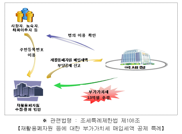 - 매입한 사실이 없는 부적격자 등의 주민등록번호를 이용하여 부당하게 공제 신고한 재활용폐자원 매입금액을 확인하고 가산세와 함께 부가가치세 13억 원을 추징(466건)