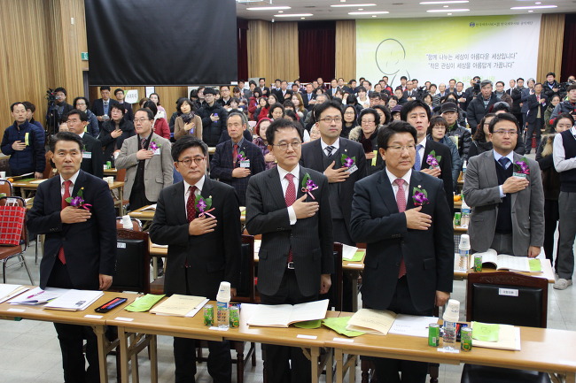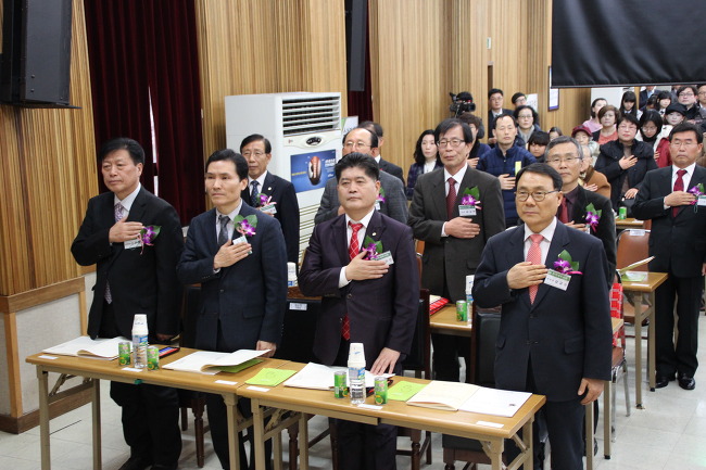 ◆ 제2회 한국세무사회 '공익재단 생활비 및 장학금 전달식'에 참석한 국회의원들이 국민의례를 하고 있다. 사진 앞줄 오른쪽부터 권성동, 강석훈, 박원석 의원. 그리고 정구정 이사장이 국기에 대한 경례를 하고 있다. 정 이사장과 박원석 의원 뒷자리가 서울회장과 중부회장 자리였으나 이날 전달식 내내 비어있었다.
