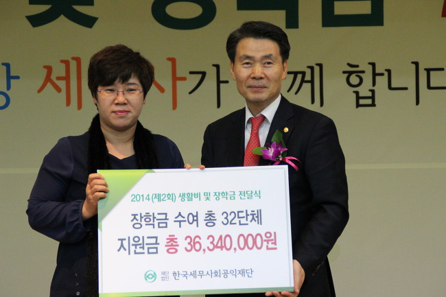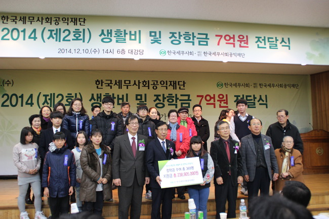 10일 세무사들이 십시일반 모은 11억원으로 출발한 '한국세무사회공익재단'이 2014년(제2회) 생활비 및 장학금 전달식을 개최됐다. 이 날 전달식에는 사회소외계층과 저소득층 가정 및 자녀 901명에게 7억원의 지원금이 전달됐다. 지난해 3억5천만원보다 두배가 늘어난 금액이다.