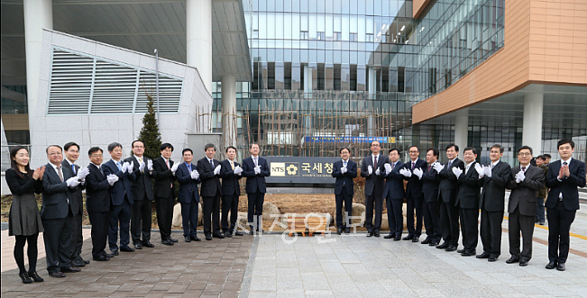 ◆ 국세청은 22일, 전날까지 세종시로의 이사를 마무리 짓고 세종시에 새로 마련된 국세청 신 청사에서 입주식을 가졌다. 임환수 청장을 비롯한 국세청 간부들이 현판식을 가진후 화이팅을 외치고 있다.