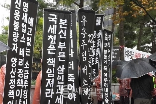 이날 집회는 △분별없는 국세청은 생계형 유흥주점 개별소비세 소급추징 즉각 철회하라 △무리한 세금 추징으로 목숨까지 앗아가는 사람 잡는 국세청은 세금폭탄 사죄하라 △영세한 자영업자 죽음으로 내모는 개별소비세 소급 추징 즉각 철회하라 등의 구호를 외치고 해산했다.