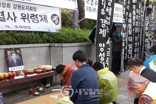 한국유흥음식업중앙회(회장 오호석, 한국직능경제인단체 총연합회장)는 15일 오후 2시 서울 수송동 국세청 앞에서 ‘故 정영수 강원도지회장의 위령제’ 및 ‘영세유흥주점 개별소비세 규탄대회’를 가졌다.