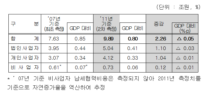이하는 한국조세재정연구원에서 납세협력비용을 측정한 결과임