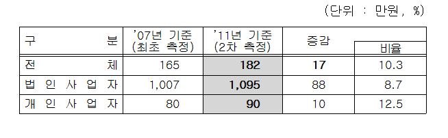 □ 1업체당 납세협력비용은 ’07년 기준 165만원에서 ’11년 기준 182만원으로 17만원(10.3%) 증가한 것으로 확인되며,